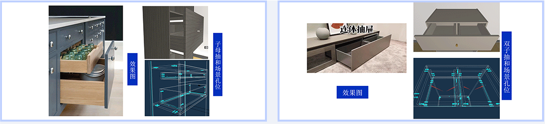实现抽屉的多元化设计。子母抽、双子抽、竖抽、暗抽应有尽有,拖拽就能随意设计,导轨的物料根据抽盒数量可出多幅,导轨引孔也可以实现。